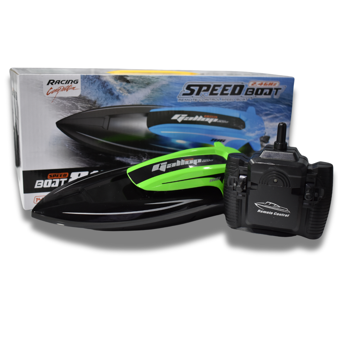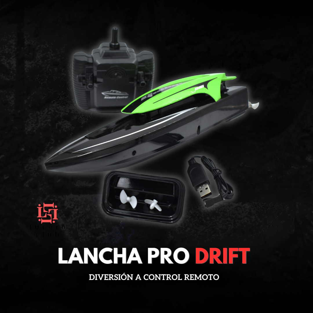 El paquete incluye la lancha Pro Drift, control remoto, cable de carga USB y dos hélices de respuesto.