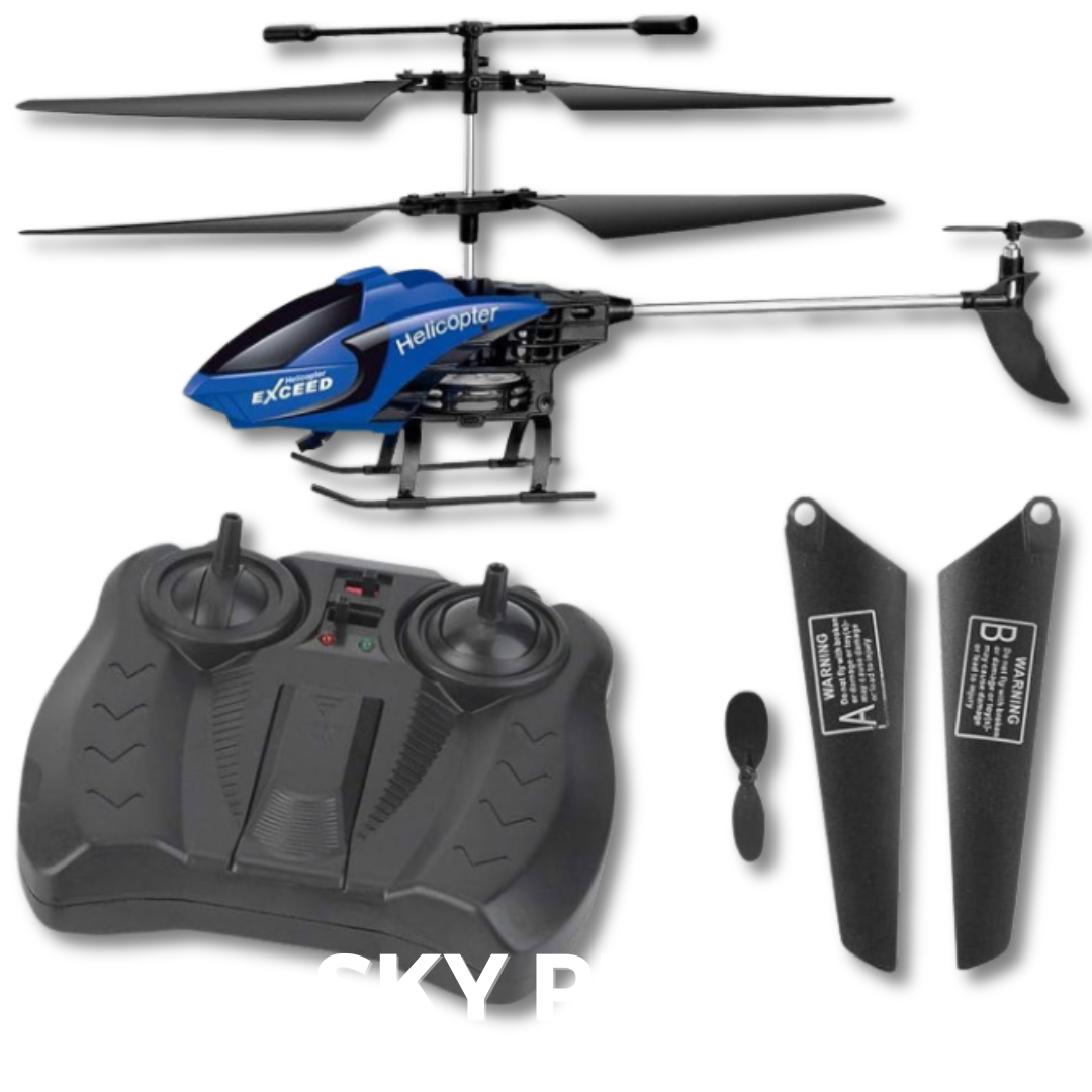 El paquete incluye el helicóptero SkyPilot, control remoto, cable de carga USB y manual del usuario.