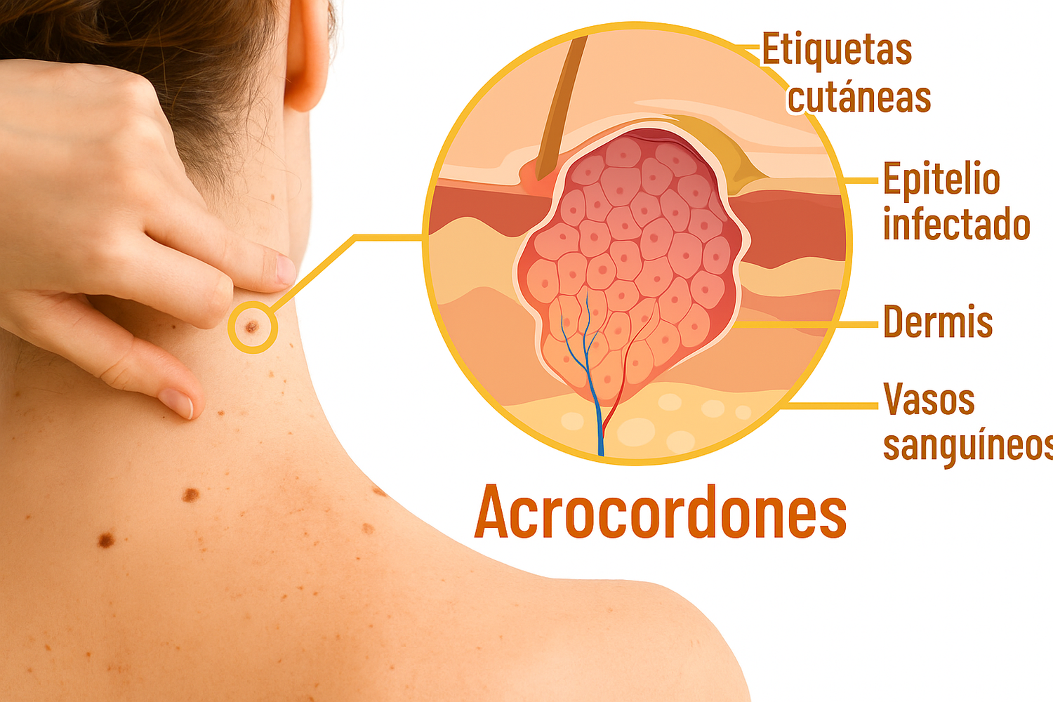 Los acrocordones, también conocidos como verrugas cutáneas, son crecimientos benignos, blandos y pequeños que sobresalen de la piel . Suelen aparecer como colgajos de piel diminutos, de color carne o ligeramente más oscuros , a menudo adheridos a la piel por un tallo o pedúnculo delgado. Las verrugas cutáneas son comunes, pero factores como la fricción, los cambios hormonales, la genética, la obesidad y la resistencia a la insulina pueden contribuir a su formación