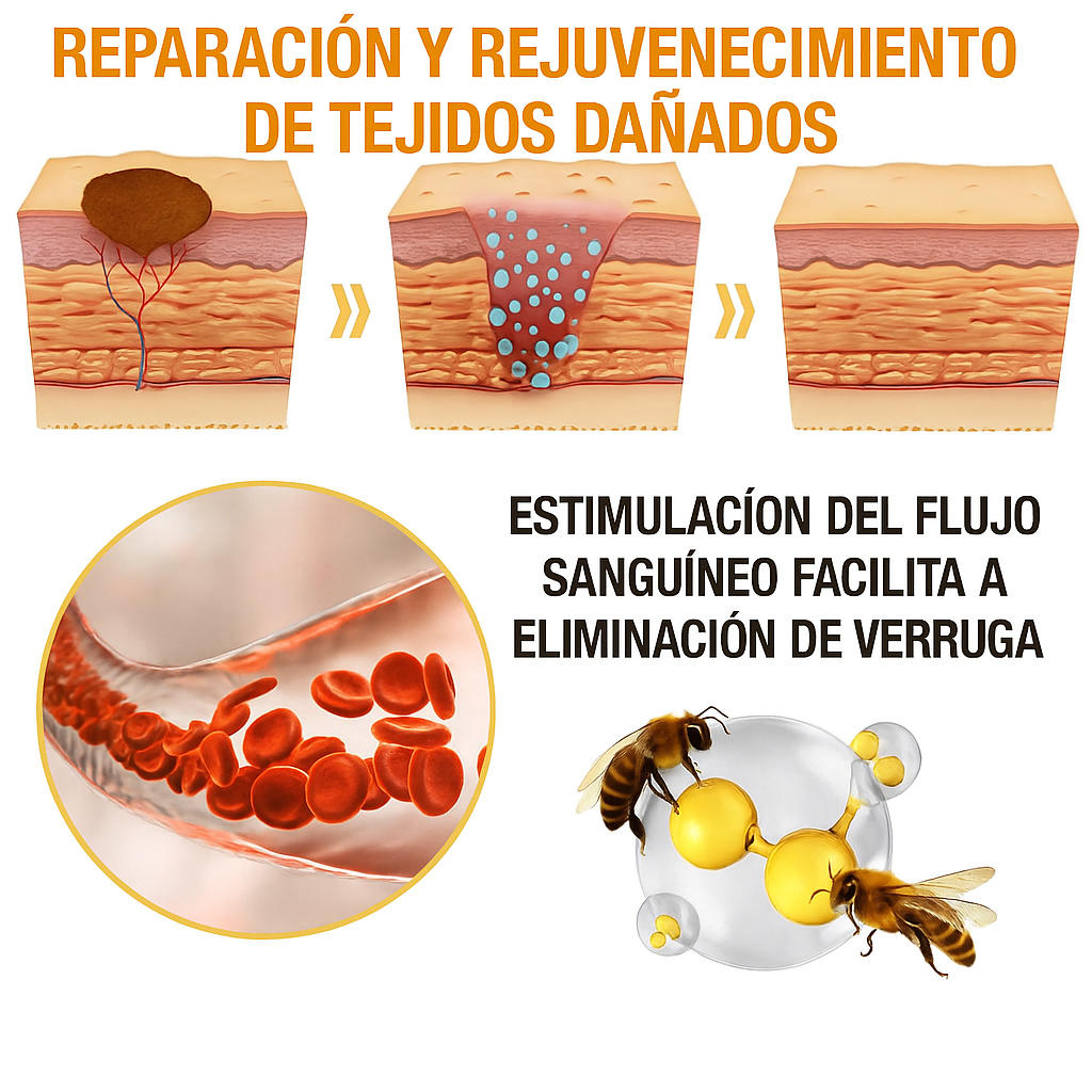 Otra ventaja importante del veneno de abeja es su capacidad para mejorar la circulación sanguínea . Puede estimular el flujo sanguíneo en el área tratada , facilitando la eliminación de verrugas o marcas en la piel al promover la regeneración de los tejidos y acelerar el proceso de curación , ayudando a la reparación y el rejuvenecimiento de los tejidos dañados