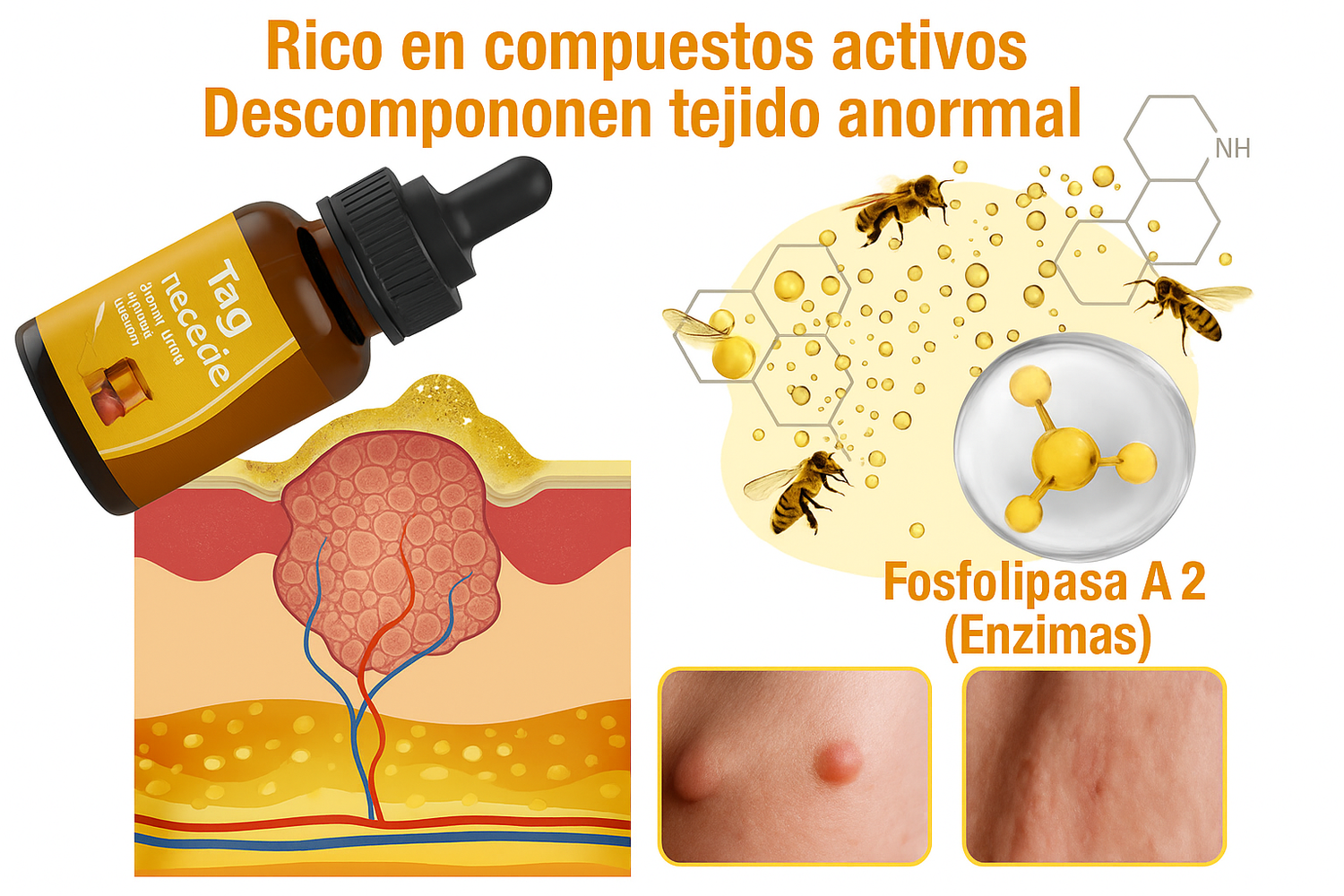 El veneno de abeja contiene varios compuestos bioactivos, entre ellos la melitina, la apamina y la adolapina, que se ha demostrado científicamente que combaten las verrugas o acrocordones de forma eficaz . Entre su arsenal de enzimas, la fosfolipasa A2 destaca por su capacidad para descomponer el tejido anormal , simplificando el proceso de eliminación de verrugas o acrocordones