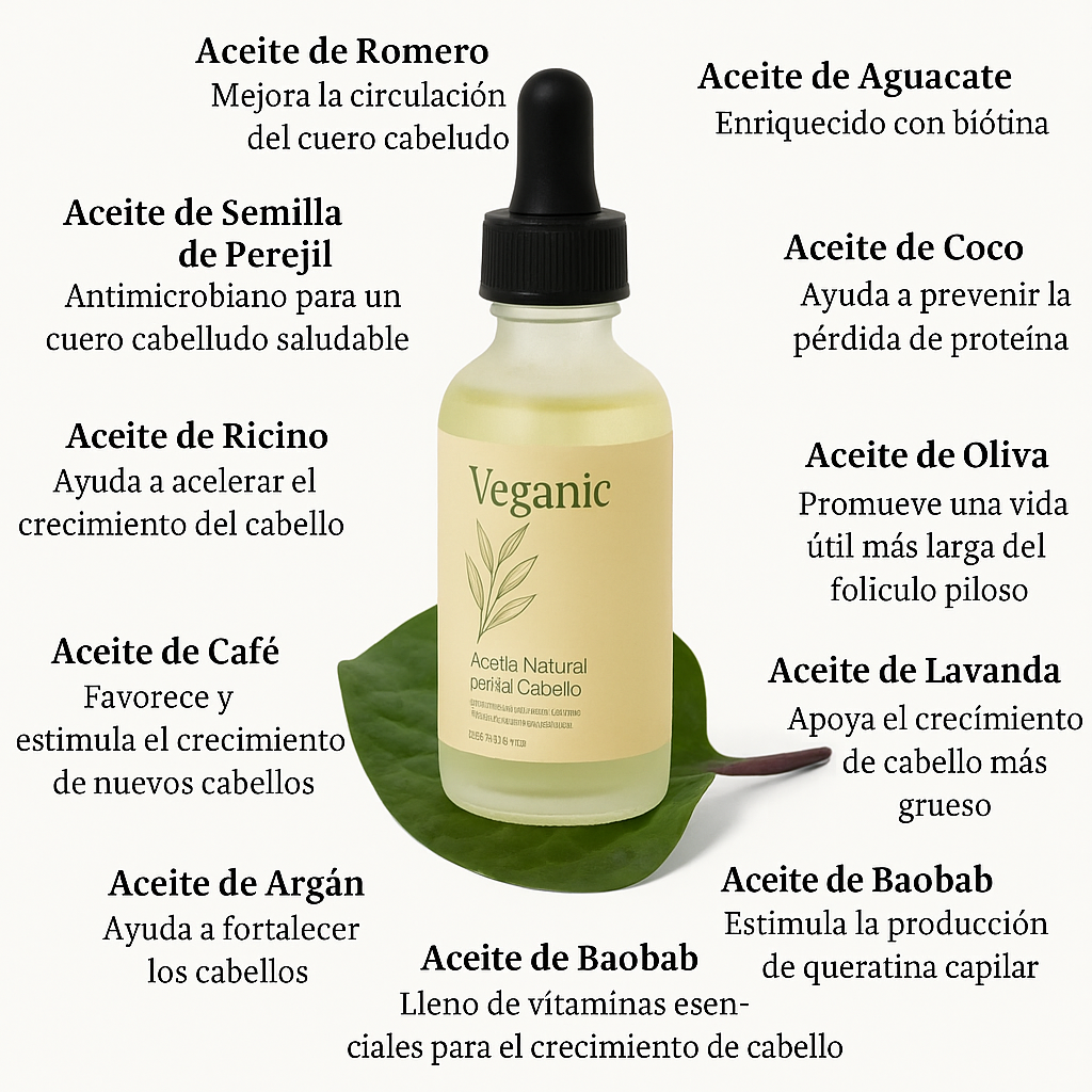 Nuestro aceite vegano natural para el crecimiento del cabello está repleto de más de 10 aceites naturales y potentes para que tu cabello crezca más rápido, más largo, más grueso y más saludable.